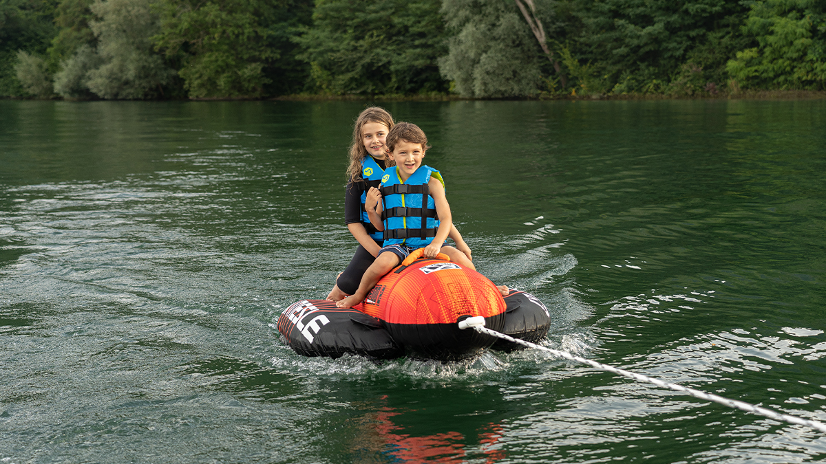 Les tubes latéraux plus larges rendent le bateau banane plus résistant au basculement et plus sûr pour les enfants. De plus, le canot ne se renverse pas au moindre virage, ce qui permet d'atteindre des vitesses plus élevées et d'avoir plus d'action.